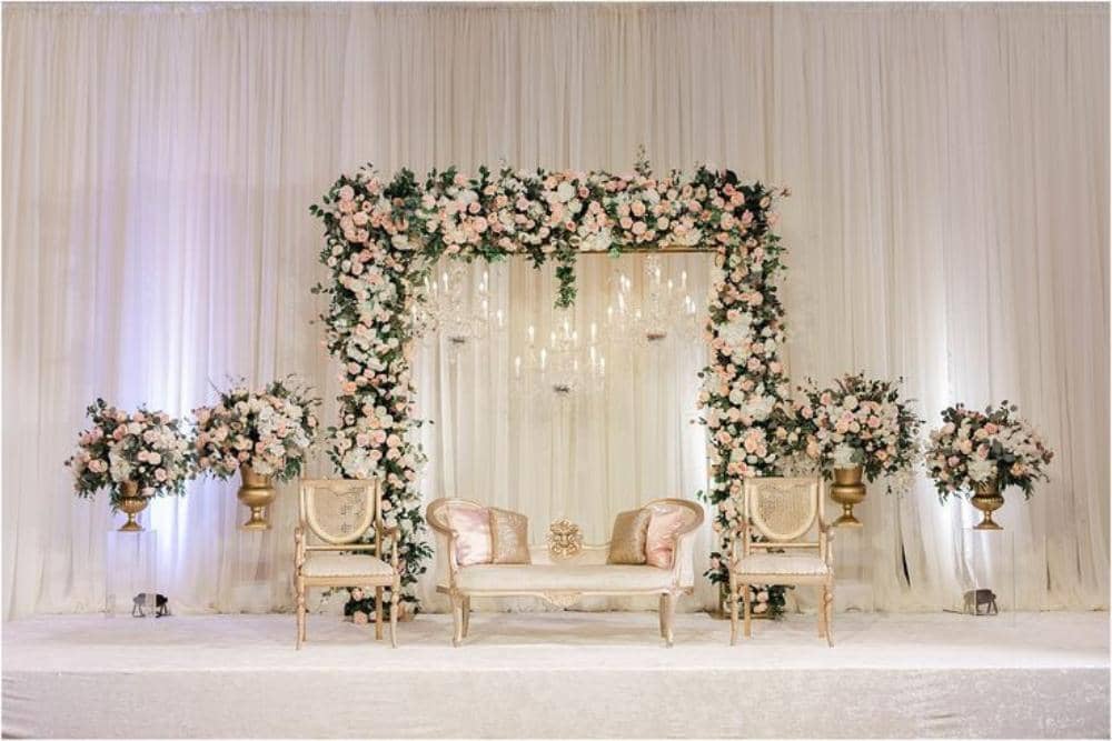 Meskipun menggunakan konsep yang simpel, tetapi kamu tetap bisa menggunakan unsur warna yang mewah seperti rose gold. Kamu bisa menggunakan warna tersebut sebagai warna dasarnya saja. Sementara untuk hiasannya, letakkan bunga-bunga di sisi belakang background menggunakan lengkungan yang minimalis. -