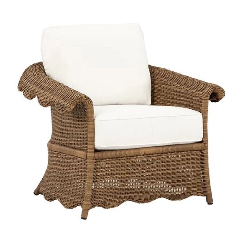 Didesain oleh Kathy Kuo untuk labelnya yang bernama sama, kursi luar ruang yang anggun ini memiliki anyaman sintetis tahan cuaca yang dibuat secara manual, detail scallop yang halus, dan bantal Sunbrella yang nyaman untuk kenyamanan dan gaya yang tahan lama.