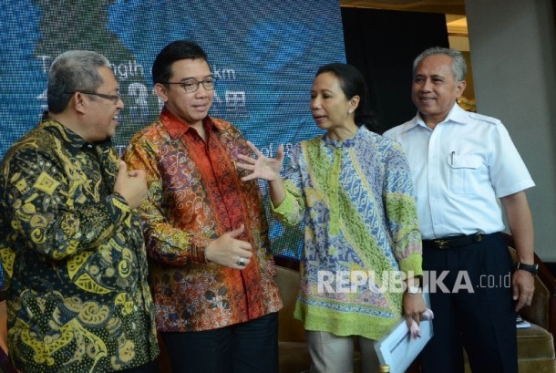 Dirut PT Kereta Cepat Indonesia Cina (KCIC) Hanggoro Budi Wiryawan, Menteri BUMN Rini Soemarno, Ketua Kadin Jabar Agung Suryamal Sutrisno dan Gubernur Jabar Ahmad Heryawan berbincang usai Sosialisasi dan Dialog Publik Pembangunan KCIC pada 2016. – (PasarModern.com/ Edi Yusuf)