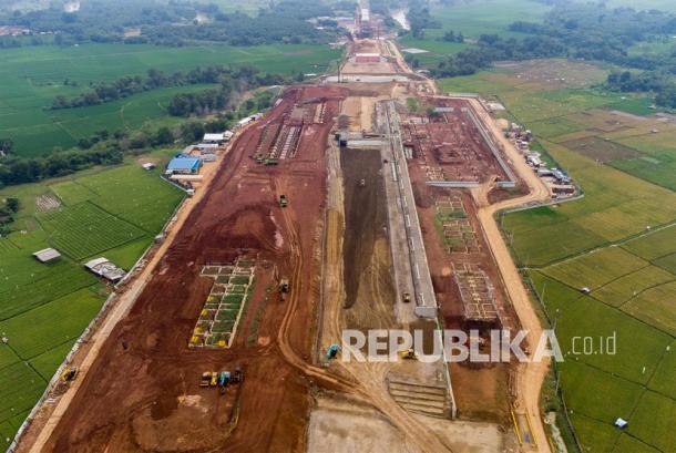 Foto udara proyek pembagunan stasiun dan jalur Kereta Cepat Jakarta – Bandung di Telukjambe Barat, Karawang, Jawa Barat, Rabu (19/5/2021). – (Antara/M Ibnu Chazar)