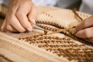 Konstruksi ini menekankan kualitas bahan kayu dan setiap bagian didukung oleh kerangka yang memungkinkan pemeriksaan dekat terhadap anyaman, pola, dan warna.