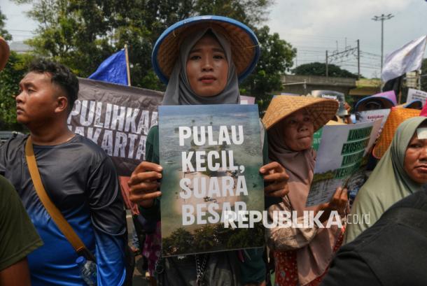 Warga Pulau Pari bersama aktivis lingkungan menggelar aksi damai dan kreatif di depan Gedung Kementerian Kelautan dan Perikanan (KKP), Jakarta, Rabu (8/10/2025). – (PasarModern.com/Prayogi)