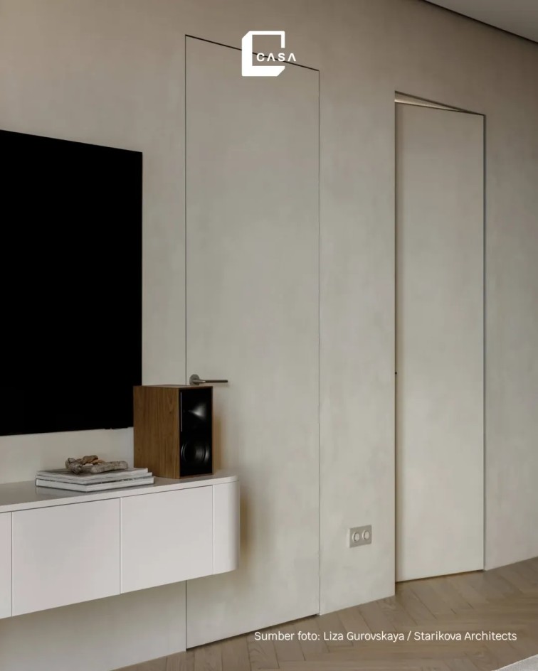 Satu lagi model pintu kamar tidur terbaru dengan konsep hidden door menggunakan sistem floor hinge, menghadirkan tampilan yang clean dan nyaris tak terlihat karena menyatu dengan dinding tanpa penggunaan kusen yang mencolok. Model pintu ini bertumpu pada engsel jenis floor hinge yang ditanam di lantai, membuat mekanisme bukaan pintu tetap kokoh sekaligus tersembunyi. Desain pintu seperti ini menciptakan kesan modern, rapi, dan eksklusif, menjadikannya ideal untuk hunian yang mengutamakan tampilan seamless tanpa mengesampingkan aspek fungsionalnya untuk penggunaan sehari-hari.