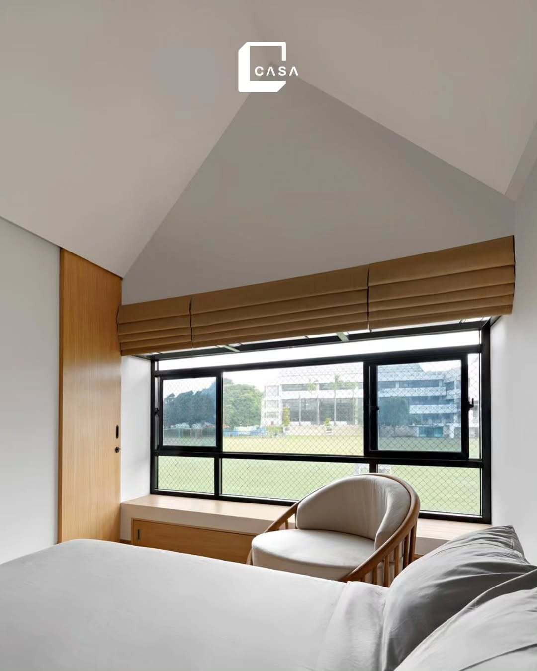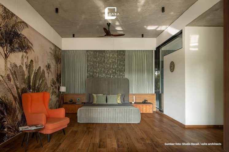 Kamar tidur ini menggunakan model pintu dengan kombinasi material kaca dan kayu dengan sistem geser atau sliding door, yang tak hanya fungsional tetapi juga hemat ruang karena tidak membutuhkan area bukaan yang luas. Bingkai kayu memberikan kesan hangat dan natural, sedangkan panel kaca memungkinkan cahaya alami masuk ke dalam kamar secara optimal, membuat kamar terasa lebih terang dan lapang. Dipadukan dengan motif wallpaper yang bernuansa alam dan posisi kamar tidur yang terhubung langsung ke area teras belakang rumah, semakin menegaskan nuansa tropis modern yang nyaman dan menyatu dengan alam pada kamar tidur. Untuk menjaga privasi ke dalam kamar tidur, Anda bisa menggunakan blackout curtain yang menutupi keseluruhan pintu kaca.