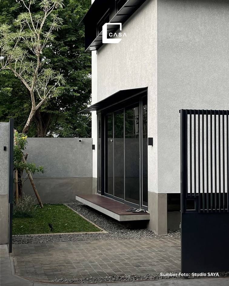 Rumah ini menggunakan sistem geser double track, memungkinkan masing-masing panel digeser ke kanan dan kiri secara bersamaan. Sistem ini sangat efisien untuk hunian dengan lahan terbatas. Material besi dengan desain berlubang pada bagian atas panel menambah nilai estetika sekaligus meningkatkan sirkulasi dan cahaya alami tanpa mengurangi privasi.
