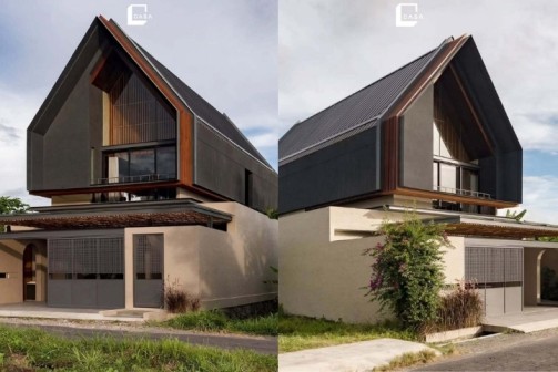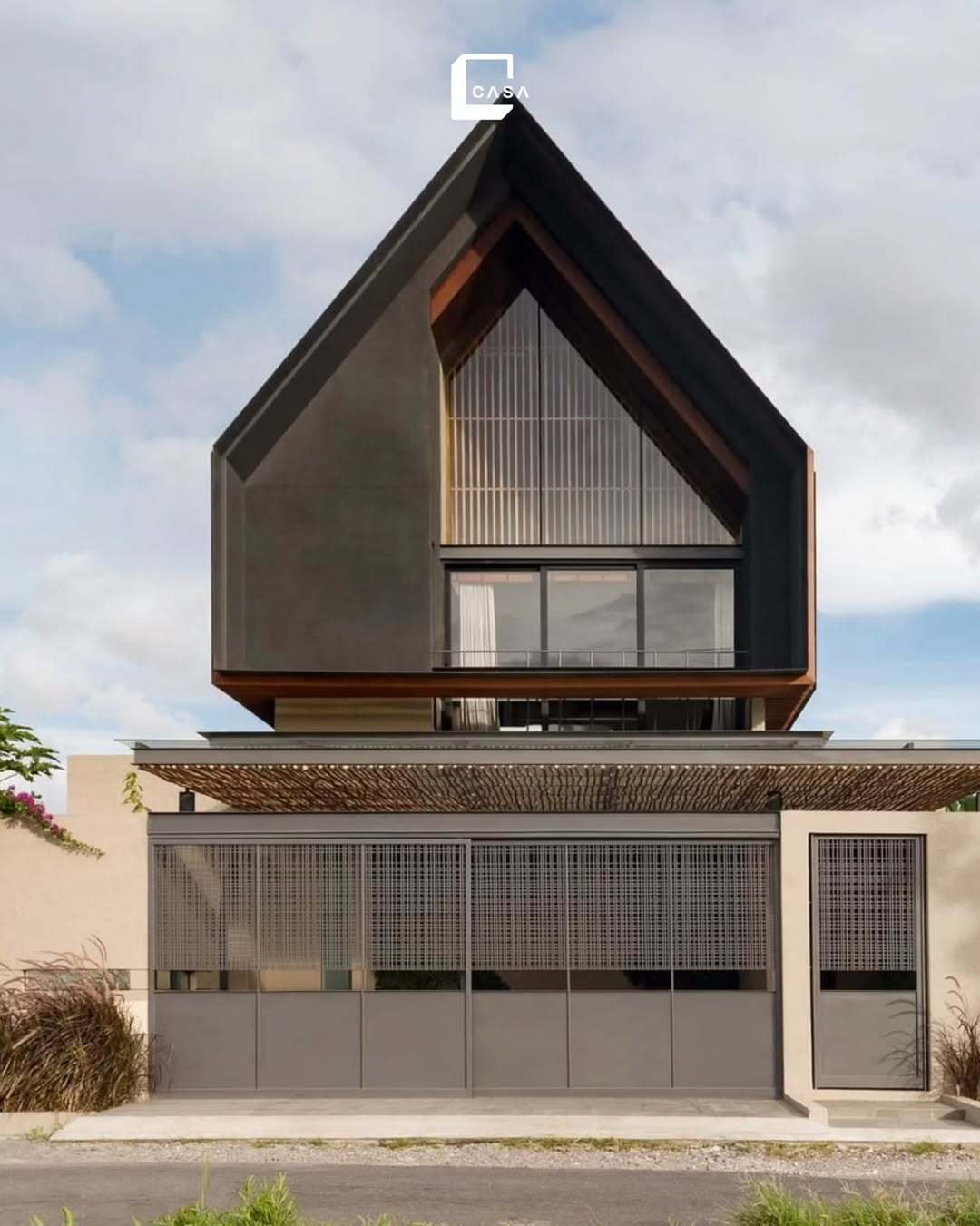 Model ini menggunakan bahan kayu dengan susunan bilah vertikal yang rapi. Perpaduan warna cokelat kayu alami dengan rangka besi abu-abu gelap memberikan kesan hangat dan natural, cocok untuk hunian bergaya modern tropis. Keseluruhan ambience rumah terasa seimbang, hangat, dan mewah tanpa terkesan berlebihan.