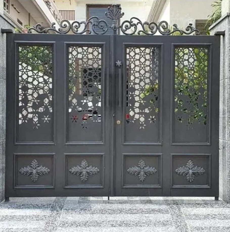 Jika menginginkan sesuatu yang berbeda, pagar perforated metal atau besi berlubang bisa menjadi alternatif menarik. Desain ini menggunakan lembaran besi dengan pola lubang-lubang geometris yang dibuat presisi. Meskipun tampil modern, model ini tetap bisa masuk dalam kategori pagar besi klasik modern jika dikombinasikan dengan rangka besi hitam dan bentuk simetris.