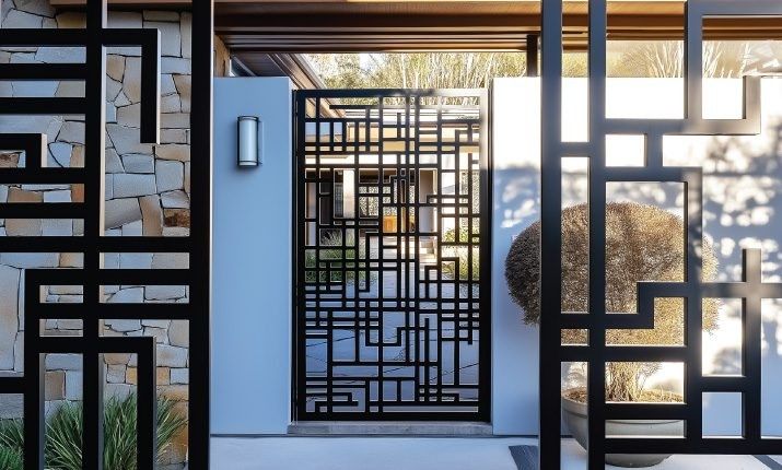 Jika menginginkan sesuatu yang berbeda, pagar perforated metal atau besi berlubang bisa menjadi alternatif menarik. Desain ini menggunakan lembaran besi dengan pola lubang-lubang geometris yang dibuat presisi. Meskipun tampil modern, model ini tetap bisa masuk dalam kategori pagar besi klasik modern jika dikombinasikan dengan rangka besi hitam dan bentuk simetris.