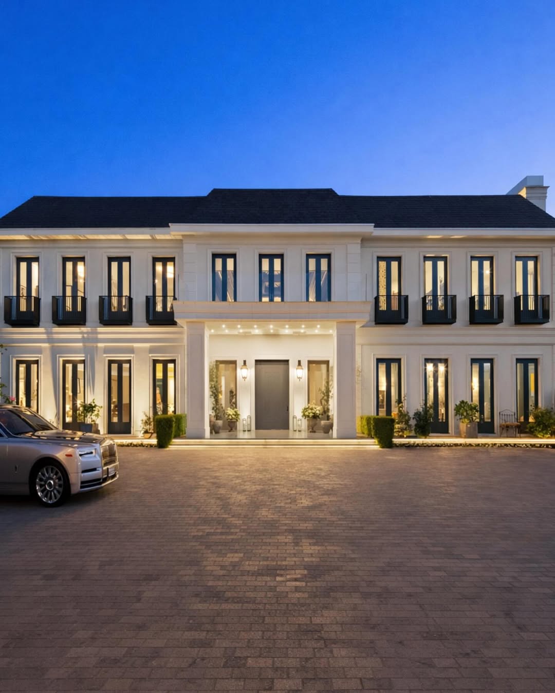 Fasad rumah ini memancarkan pesona klasik dan elegansi kontemporer yang menarik perhatian sejak pertama kali dilihat. Dibangun dari batu atau plester berwarna terang, fasad ini bercahaya di bawah penerangan yang halus, menonjolkan setiap detail arsitektur. Jendela hitam besar yang sempurna dan sejajar membawa simetri dan kesopanan sambil memungkinkan cahaya hangat dari dalam untuk menembus melalui mereka. Balkon dengan gaya minimalis menambah sentuhan yang halus dan menyeimbangkan struktur.