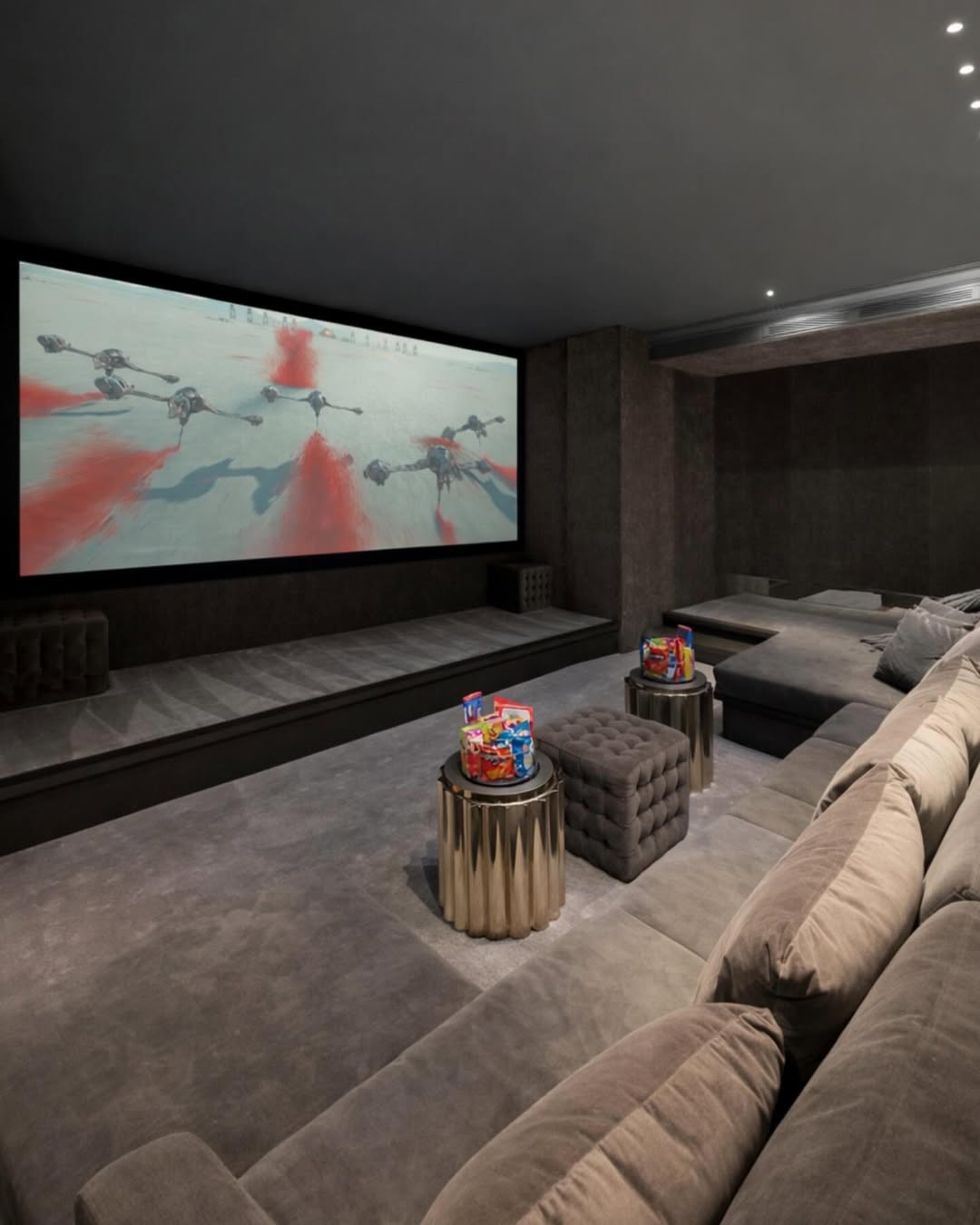 Sistem home theater menawarkan kenyamanan dan suasana yang tidak terbandingkan. Didekorasi dengan nuansa abu-abu yang anggun—dari dinding hingga sofa sutra—setiap detail dirancang dengan cermat untuk menciptakan atmosfer yang hangat dan imersif.