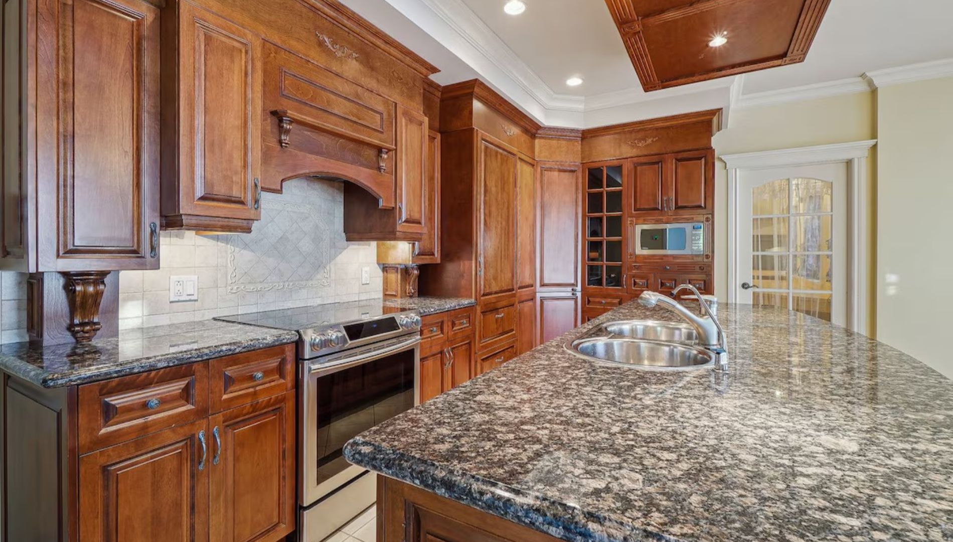 Pulau tengah yang dilengkapi dengan wastafel stainless steel ganda meningkatkan fungsi ruangan. Peralatan built-in dan detail arsitektur, seperti kubah kompor dekoratif dan hiasan langit-langit, menunjukkan perhatian yang luar biasa terhadap detail. Desain keseluruhan menunjukkan rasa kekuatan dan kemewahan, sempurna untuk rumah mewah.
