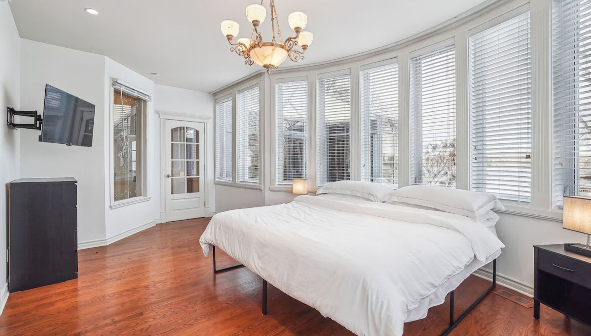 Kamar tidur utama terang dan minimalis, dengan estetika garis yang bersih yang bertentangan dengan gaya klasik ruangan lainnya. Tempat tidur besar dengan selimut putih yang bersih menjadi pusat perhatian, mengundang Anda untuk beristirahat. Jendela bay yang banyak, dilengkapi tirai, menawarkan pemandangan yang tidak terhalang dan membanjiri ruangan dengan cahaya alami.