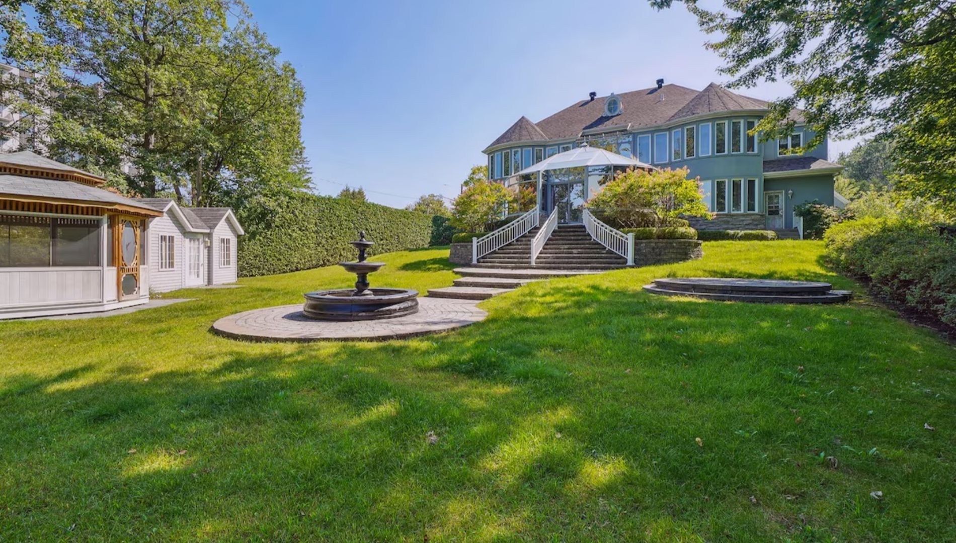Gambar ini menonjolkan pintu masuk yang megah dari perumahan tersebut, yang langsung menimbulkan kesan dengan arsitektur yang megah dan simetris. Fasadnya seluruhnya ditutupi batu abu-abu, memberikan gaya rumah yang anggun dan abadi. Bangunan utama dirancang di sekitar pintu masuk tengah yang terangkat, dapat diakses melalui tangga elegan yang dikelilingi pagar putih.