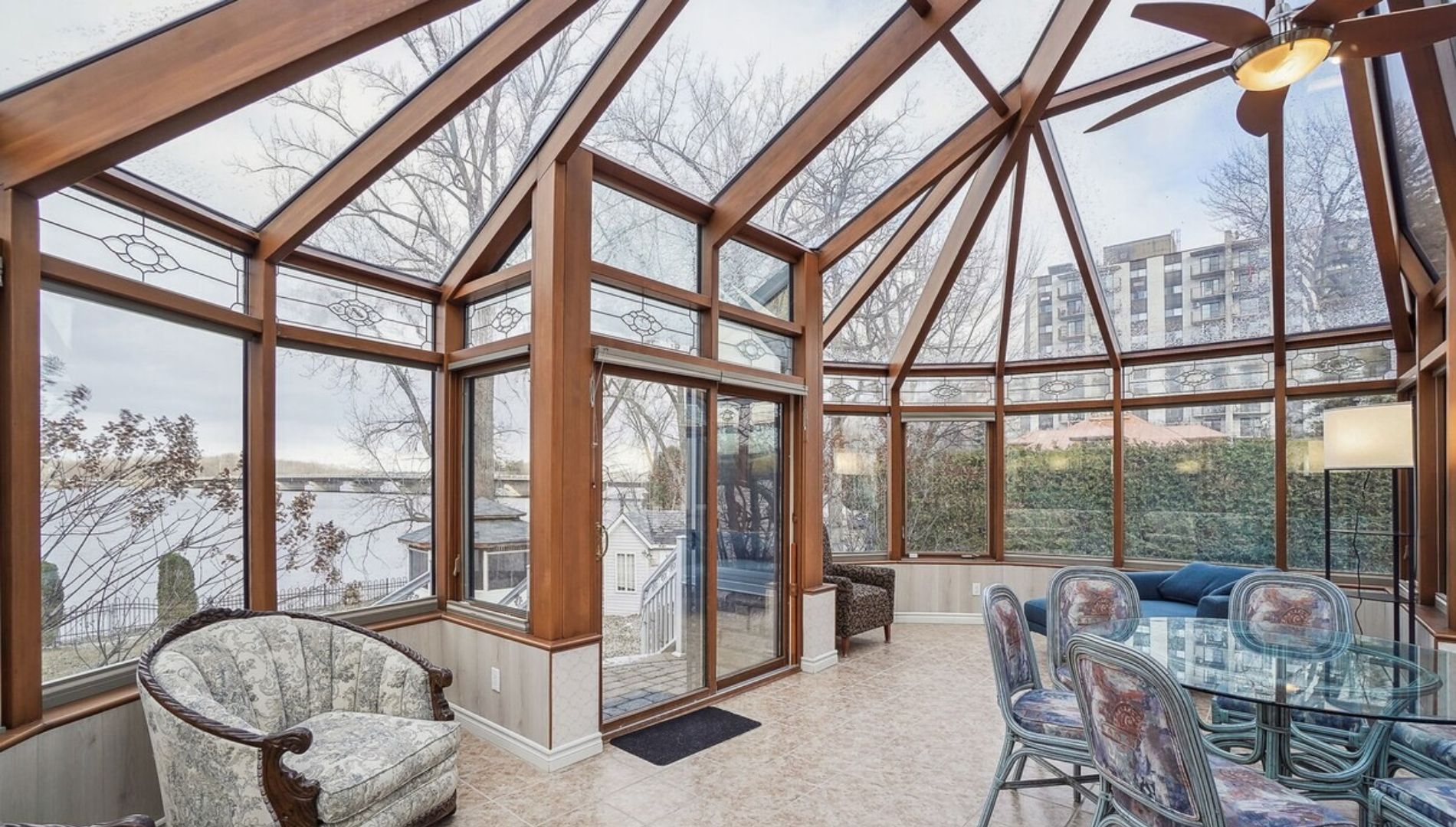 Ruangan matahari adalah perhiasan arsitektur yang sejati, sepenuhnya berlapis kaca dengan kerangka kayu yang mengingatkan pada solarium. Jendela besar menawarkan pemandangan menyeluruh ke luar ruangan, memungkinkan banyak cahaya masuk.