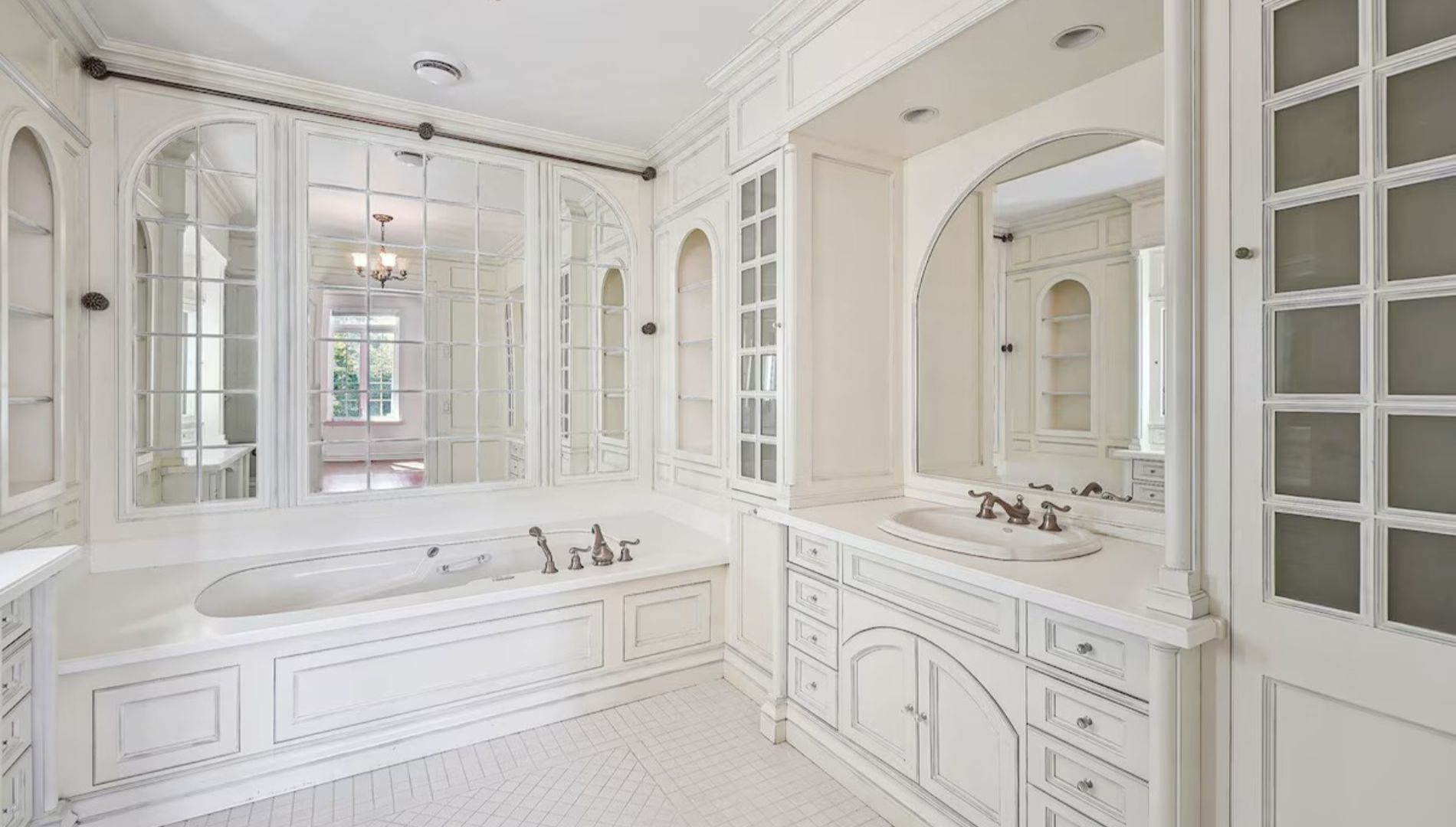 Di sini, salah satu dari empat kamar mandi terasa seperti spa pribadi yang sejati. Didominasi oleh nada putih, ruangan ini memancarkan rasa kesucian dan ketenangan. Bak mandi besar yang built-in dikelilingi oleh cermin dan panel kayu yang elegan, meningkatkan kecerahan ruangan.
