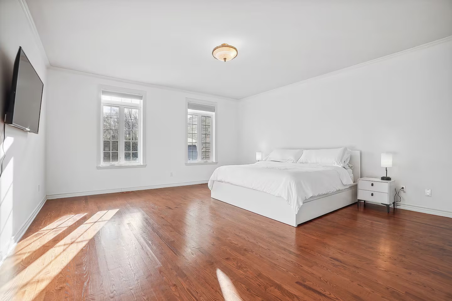Kamar ini langsung menarik perhatian dengan kecerahan luar biasanya dan suasana minimalis. Jendela besar memungkinkan cahaya alami yang indah masuk, yang menonjolkan lantai kayu hangat, menciptakan kontras yang anggun dengan dinding yang bersih. Perabot minimalis—terdiri dari tempat tidur dengan garis-garis yang bersih dan meja samping tempat tidur yang tidak mencolok—memperkuat rasa ruang dan ketenangan ini.