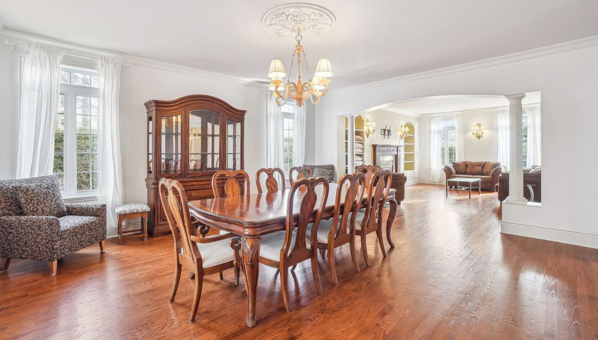 Ruangan makan yang luas ini menggabungkan keanggunan dengan cahaya alami. Meja kayu padat besar, dikelilingi kursi yang sesuai dalam desain klasik, menjadi pusat perhatian. Lampu gantung yang elegan yang digantung dari langit-langit memancarkan cahaya hangat.